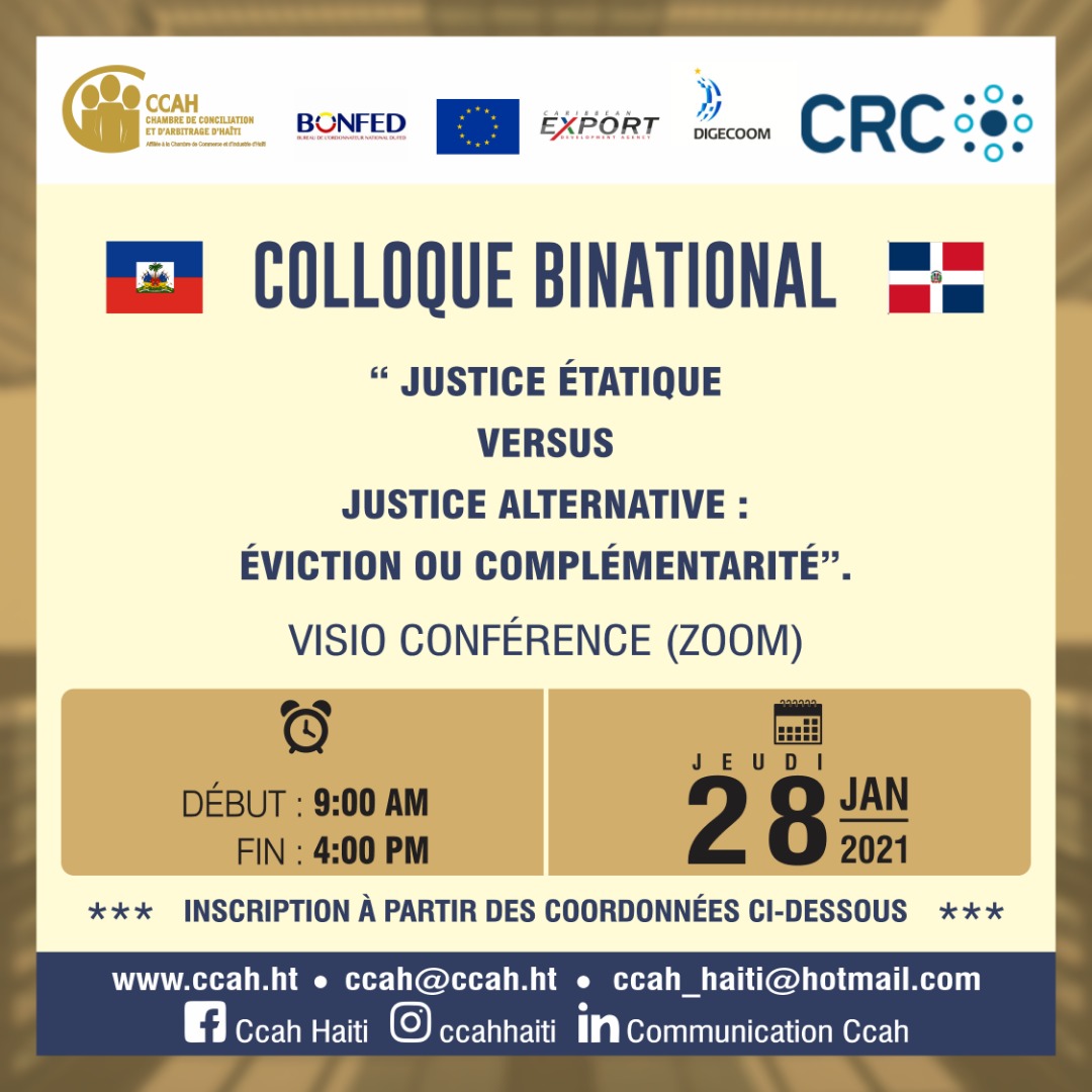 La Chambre de Conciliation et d'Arbitrage d'Haïti (CCAH) vous invite au Colloque Binational intitulé « Justice étatique versus Justice alternative : Eviction ou complémentarité », qui se tiendra le jeudi 28 janvier 2021 de 9 heures am à 4 heures pm en visio conférence (ZOOM).